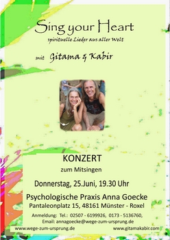 Telefonisch unter 02507-6199926. A N K O M M E N I M J E T Z T - Meditativer Entspannungstag mit Life-Musik - An diesem Sonntag wird uns das Musikerpaar Gitama & Kabir aus Costa Rica mit ihrer Musik zum Mitsingen und Entspannen einladen. Alle angeleiteten Übungen dienen dazu, sich durch Achtsamkeit in der Erfahrung der eigenen Stille zu erholen. Bei trockenem Wetter werden wir nachmittags im Wald meditieren und picknicken. Ein neuer Termin steht noch nicht fest! Anmeldung: